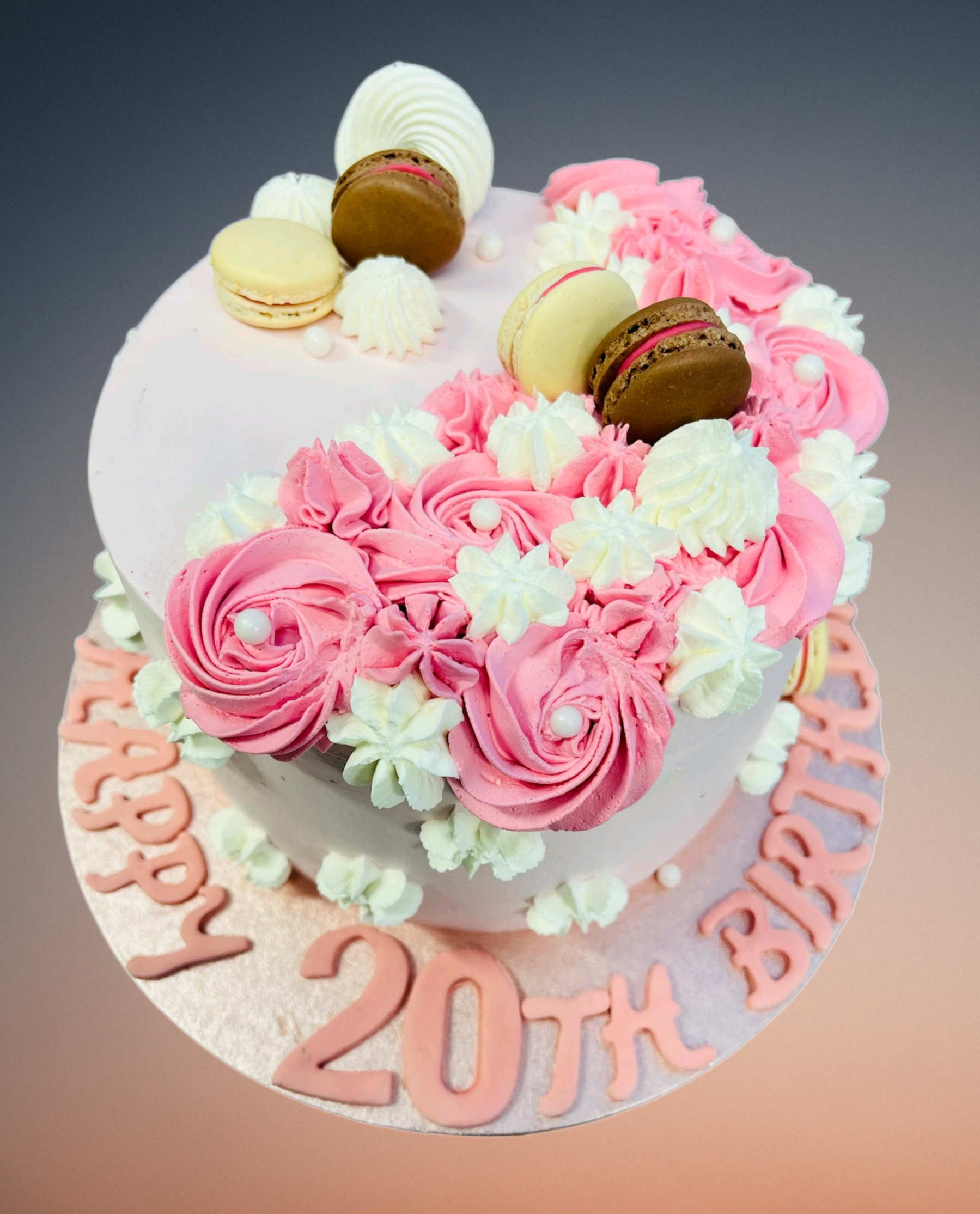 Nežná, ružová a výnimočne štýlová – táto torta je oslavou ženskosti a radosti. Bohato zdobená kvetmi z krému, makrónkami a jemnými perličkami, pôsobí luxusne a hravo zároveň.